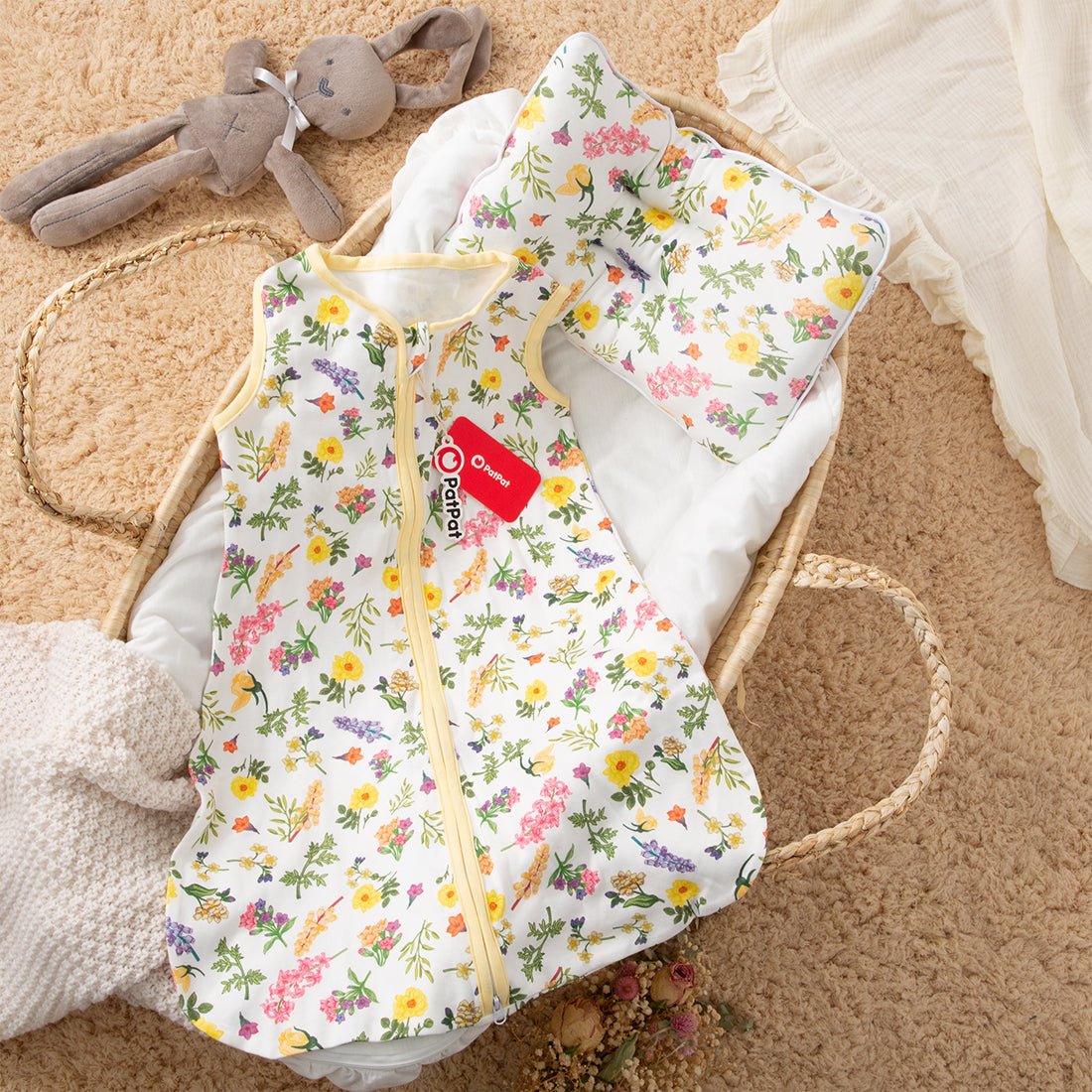 Soft, breathable 100% cotton sleeping bag, swaddle blanket and pillow set; promotes deep, restful sleep for babies aged 0-6 months with a safe, knitted design.