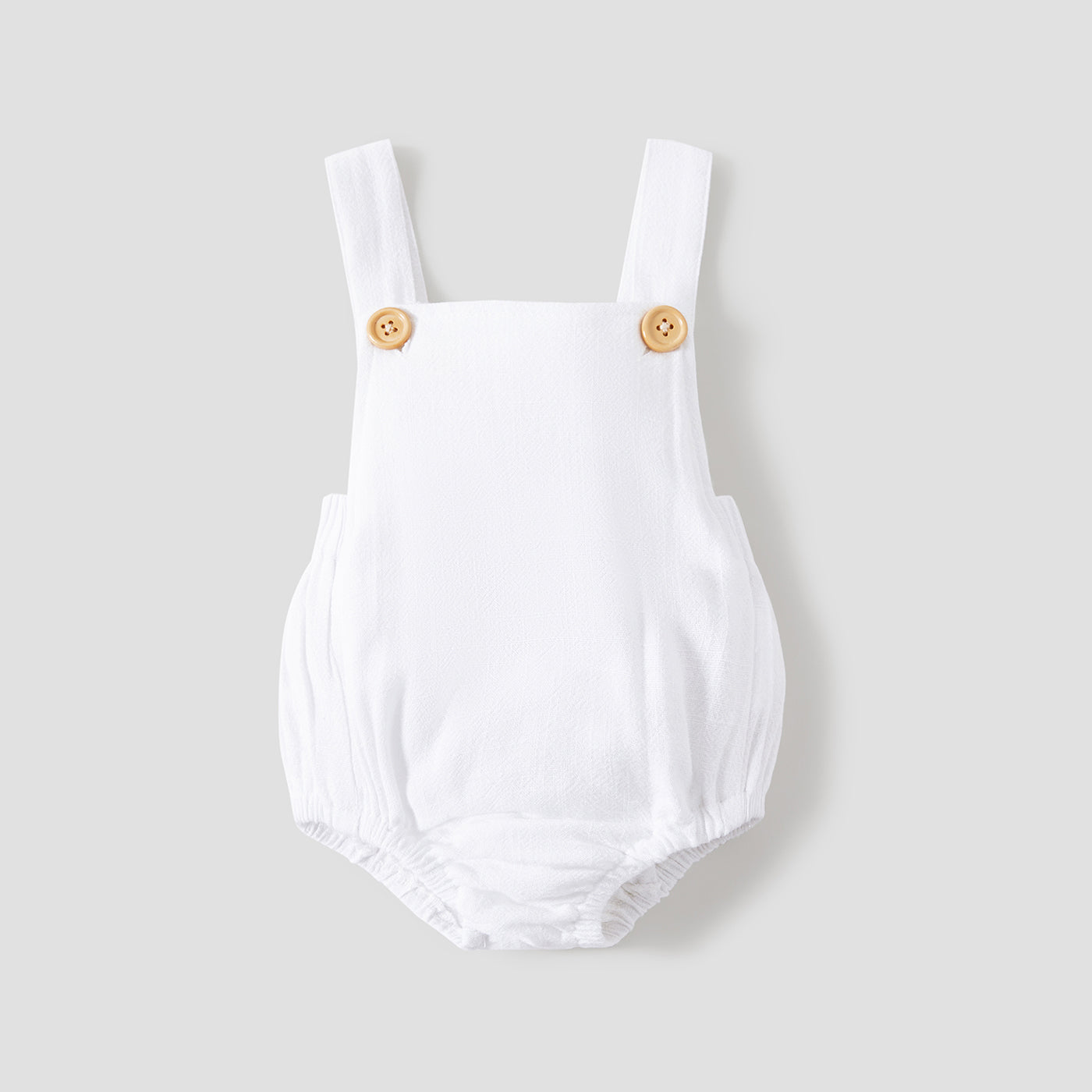 The perfect summer romper for your baby. Made with soft and comfy 100% cotton, this solid sleeveless romper features an elasticized waist and cuffs, a function button on shoulder strap, and a secret button for easy changing.
