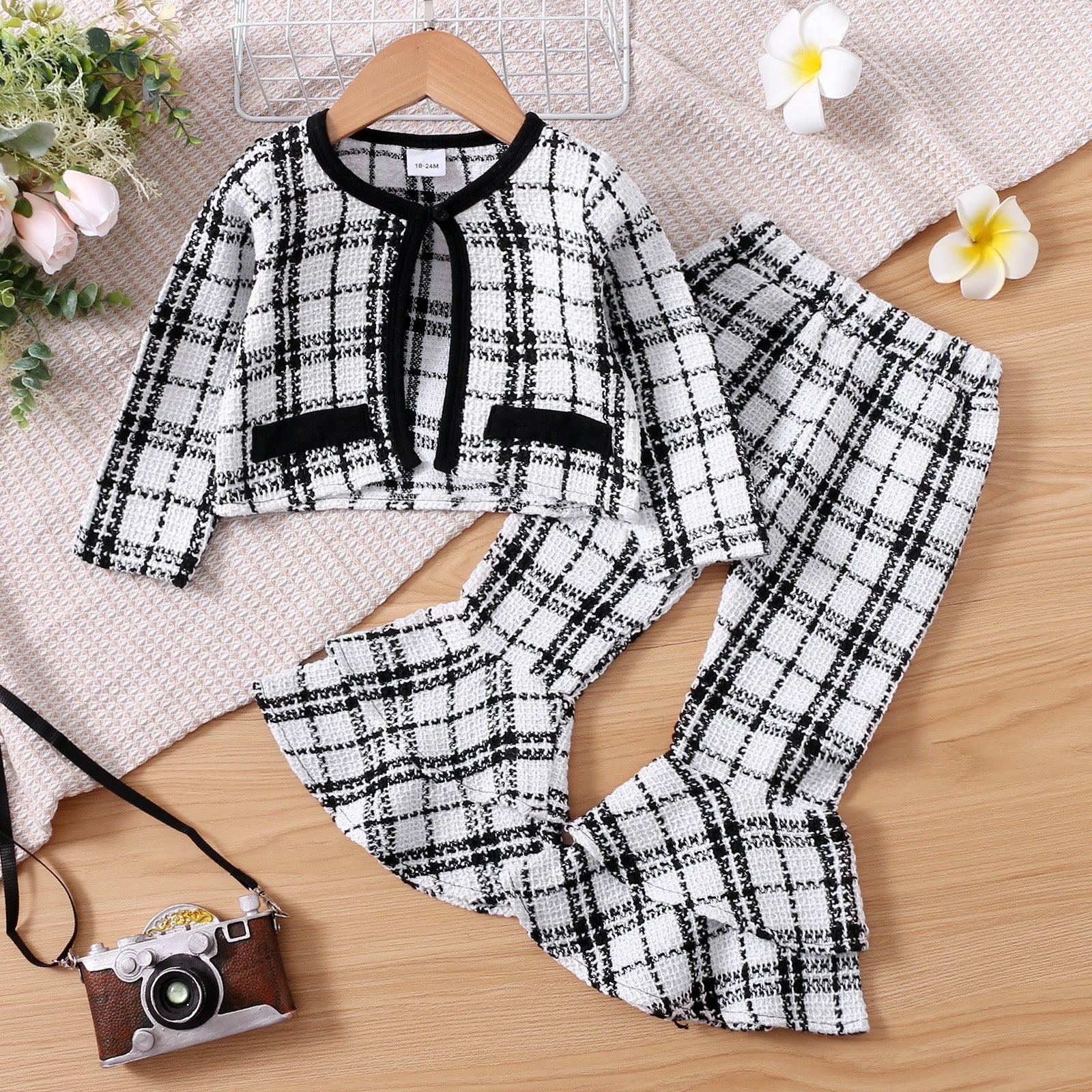 Toddler girl plaid tweed cardigan and pants set, perfect for sweet and stylish winter days.