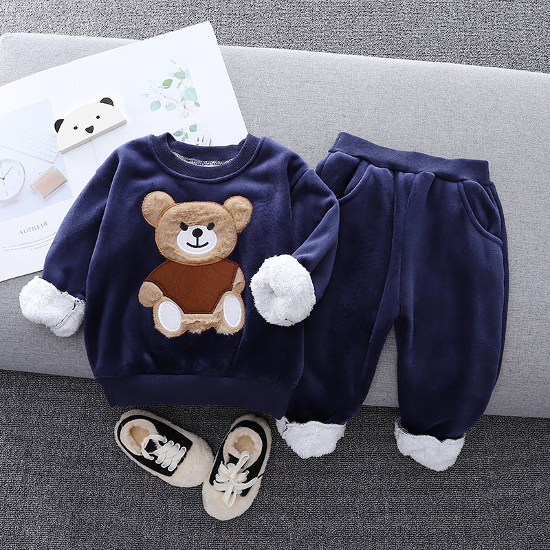 2pcs Baby Boy 95% Cotton Long-sleeve Cartoon Bear Pattern Thickened Fleece Lined Pullover and Trousers Set