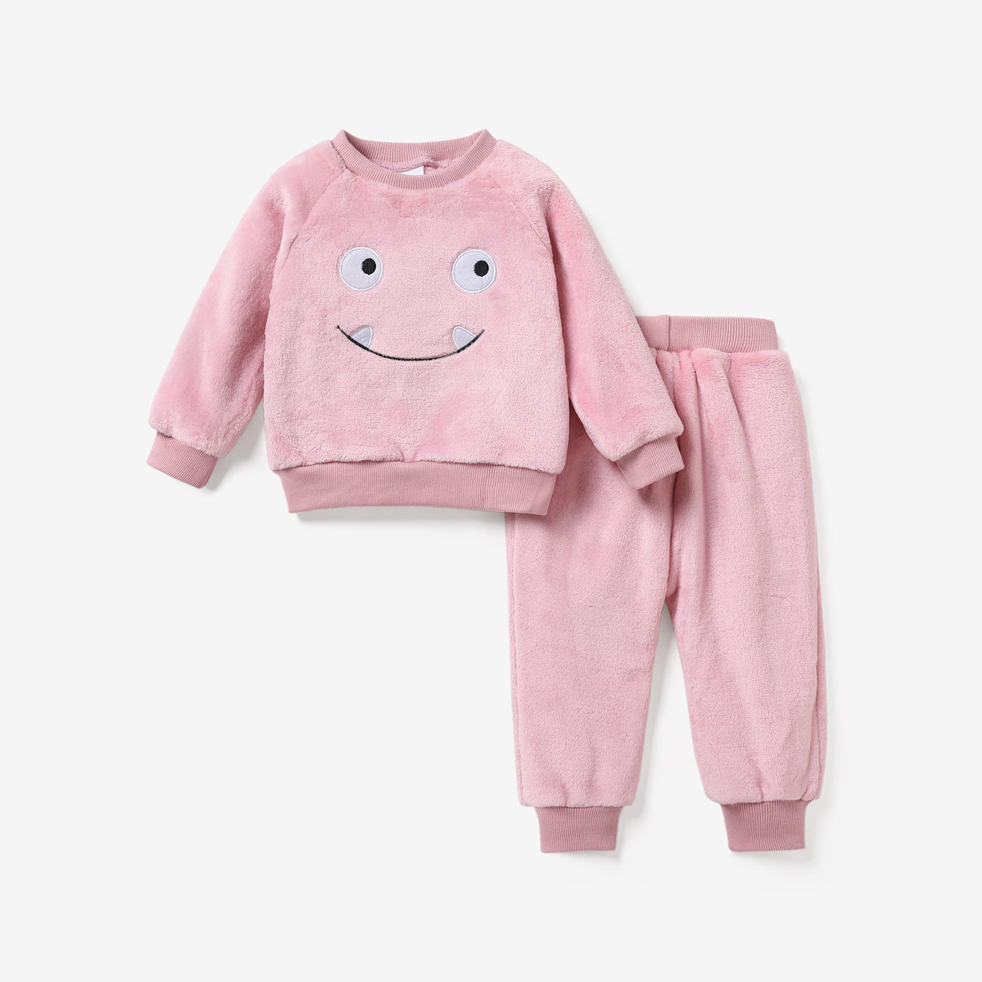 Comfy and cute, this long-sleeve velvet set includes a pullover and trouser embroidered with baby animal designs, ideal for a casual winter or fall day.