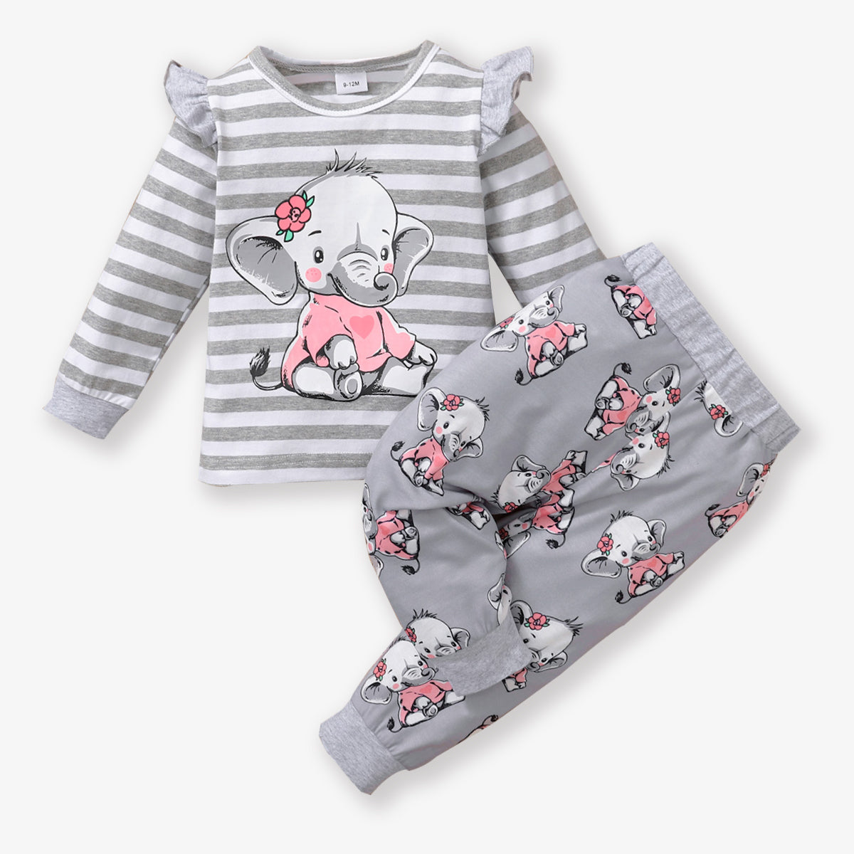 2pcs Baby Girl 95% Cotton Long-sleeve Cartoon Elephant Print Grey Striped Top and Trousers Set