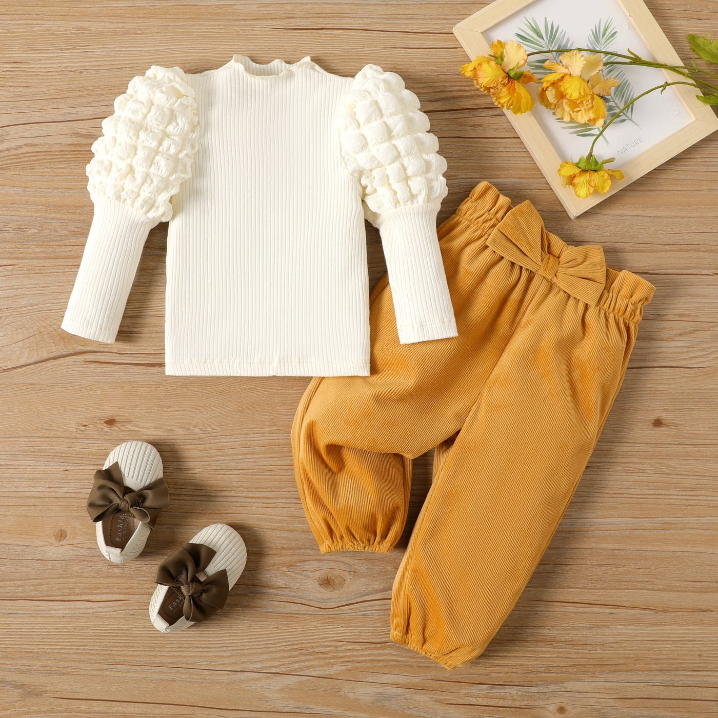 Cute and stylish baby two-piece outfit with bubble sleeves, decorative bow, and textured fabric. Perfect for daily outings in autumn.