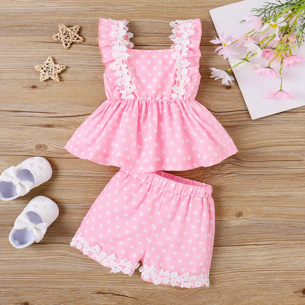 Adorable baby girl lace polka dots ruffle top and shorts set designed in a sweet style to provide ultimate comfort and fashionable look.”Fabric:”Soft and comfy made of 80% Polyester and 20% Spandex.”Care Instruction:”Machine wash and tumble dry for easy cleaning and maintenance.”Key Features:”* Product features: Lace detailing with cute polka dots ruffle.