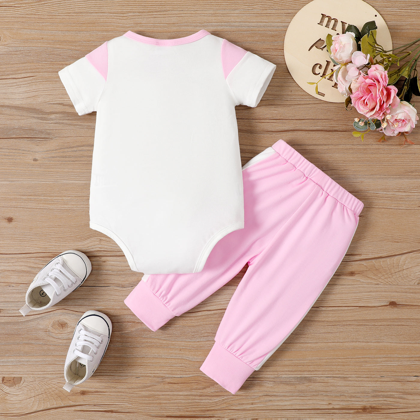 2pcs Baby Girl Leopard & Letter Print Colorblock Bodysuit and Pants Set