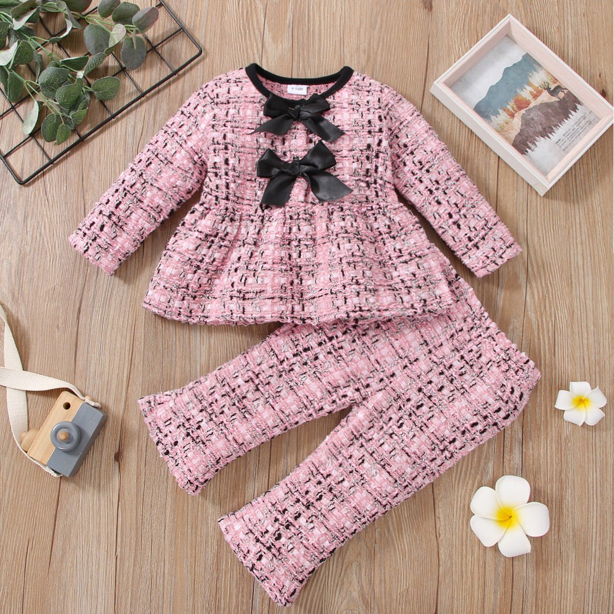 Make your little one effortlessly elegant in our Baby Pink Tweed Plaid Long-sleeve Bowknot Top and Trousers Set – perfect for any occasion!