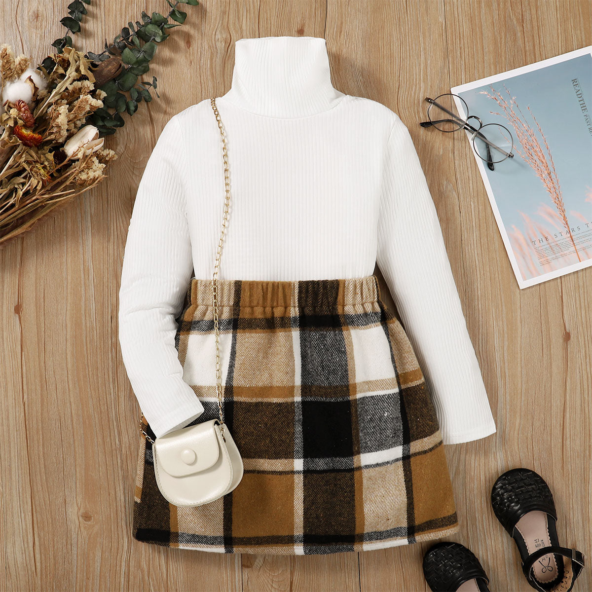 Trendy kid’s black turtleneck top with plaid skirt set.