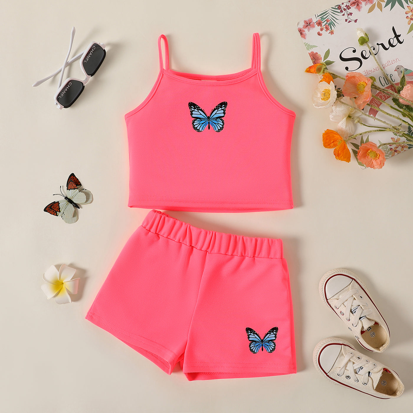 Cute butterfly print toddler girl camisole and shorts set with an avant-garde hanging strap design.