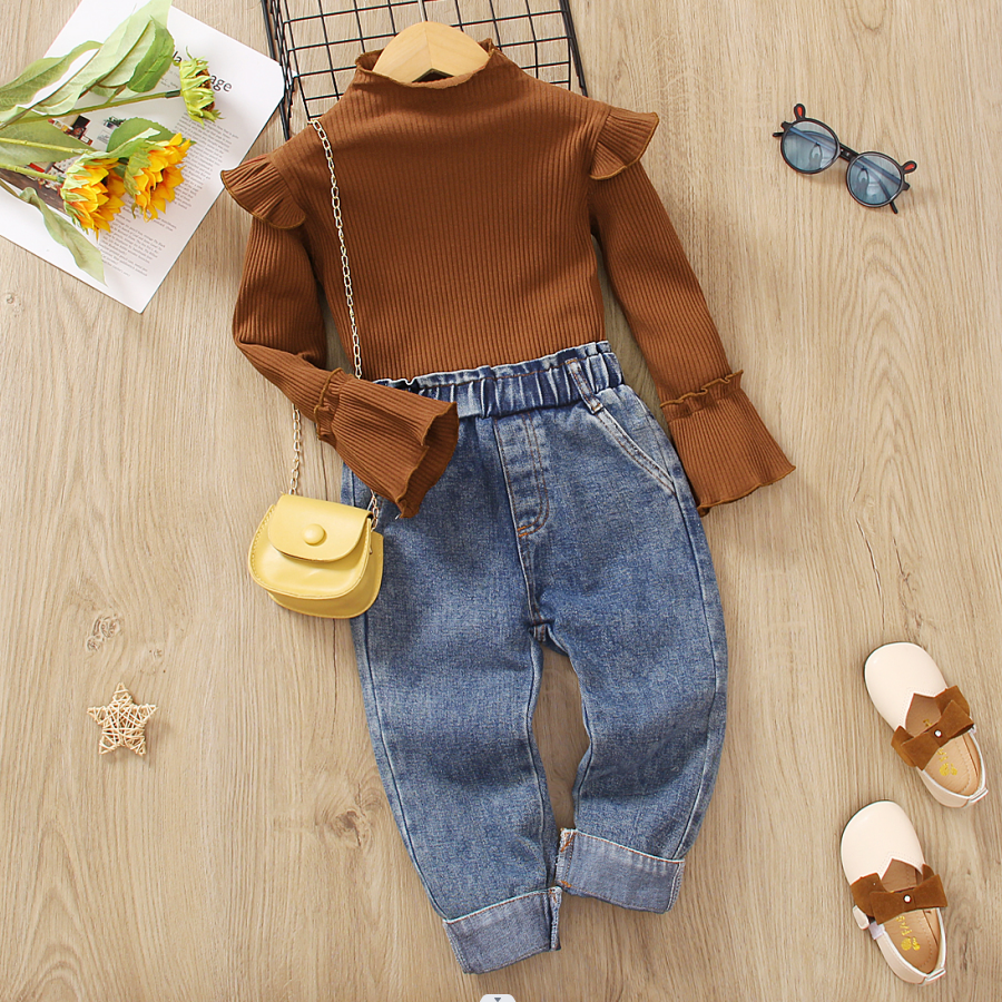 Sweet denim jeans and ruffled bell sleeves tee set for toddlers.