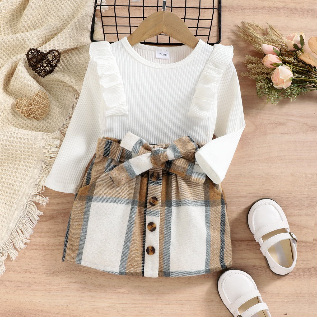 Trendy and cute 2pcs Toddler Girl Ruffled Ribbed Long-sleeve Tee and Plaid Button Design Skirt Set, perfect for your little girl’s fashionable look.