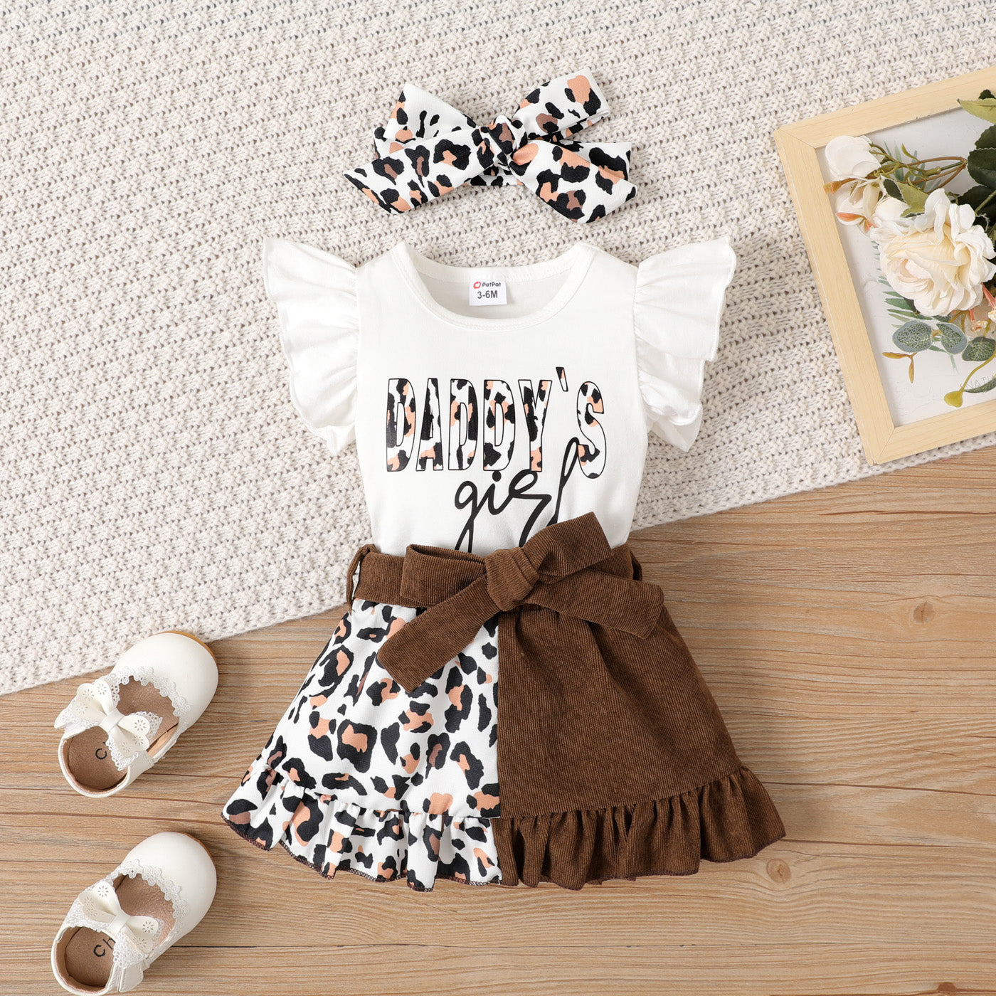 Home » Shop » 3pcs Baby Girl 95% Cotton Leopard Letter Print Flutter-sleeve Bodysuit & Belted Skirt & Bow Headband Set