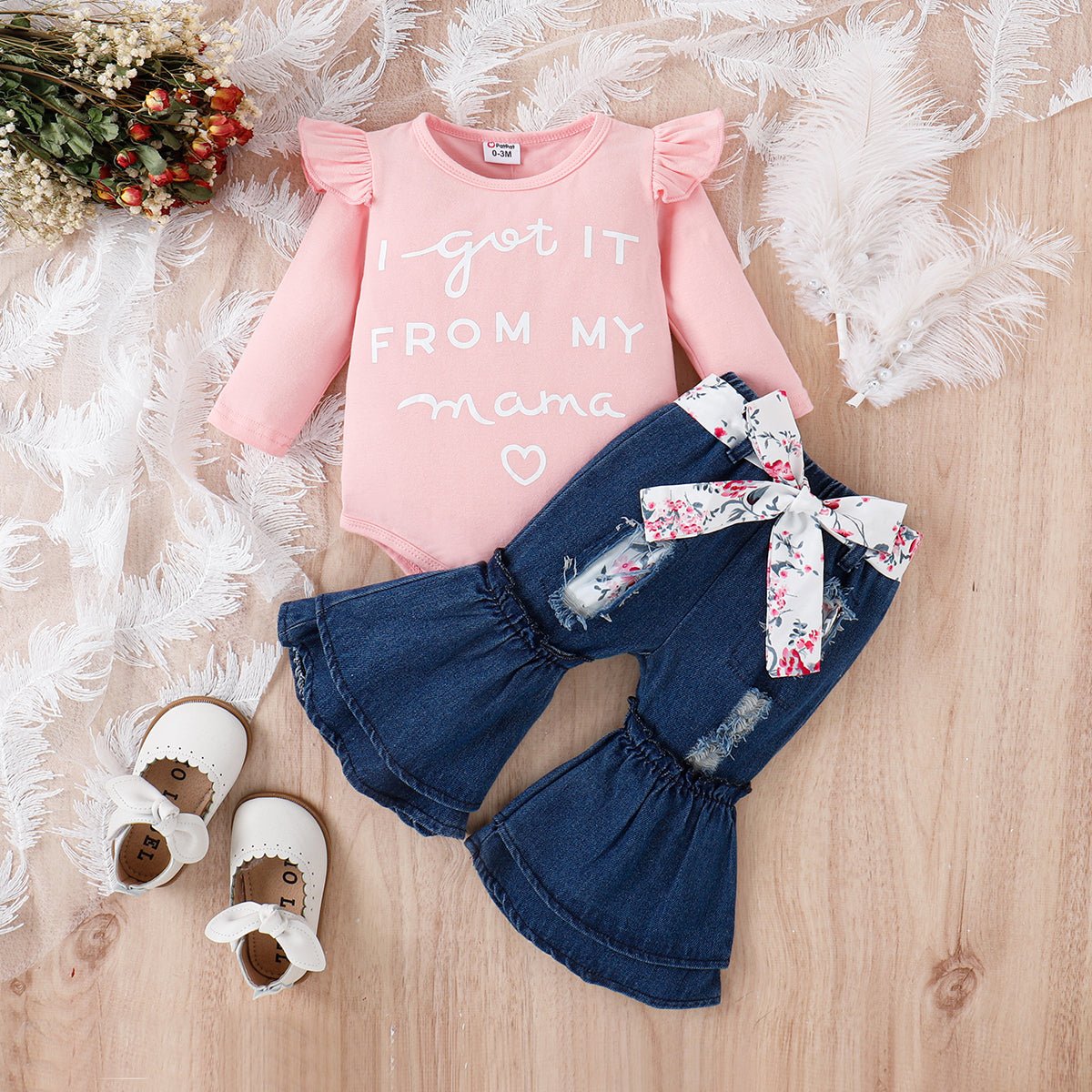 Get the sweetest and most comfortable baby girl clothes with our 3pcs Baby Girl 95% Cotton Letter Print Ruffle Trim Long-sleeve Romper and Ripped Flared Jeans & Belt Set.”Fabric:”Romper made with 95% cotton 5% polyester; Jeans made with 98% polyester 2% spandex.”Care Instruction:”Machine wash and tumble dry for easy cleaning.”Key Features:”* Product features: 3pcs Set