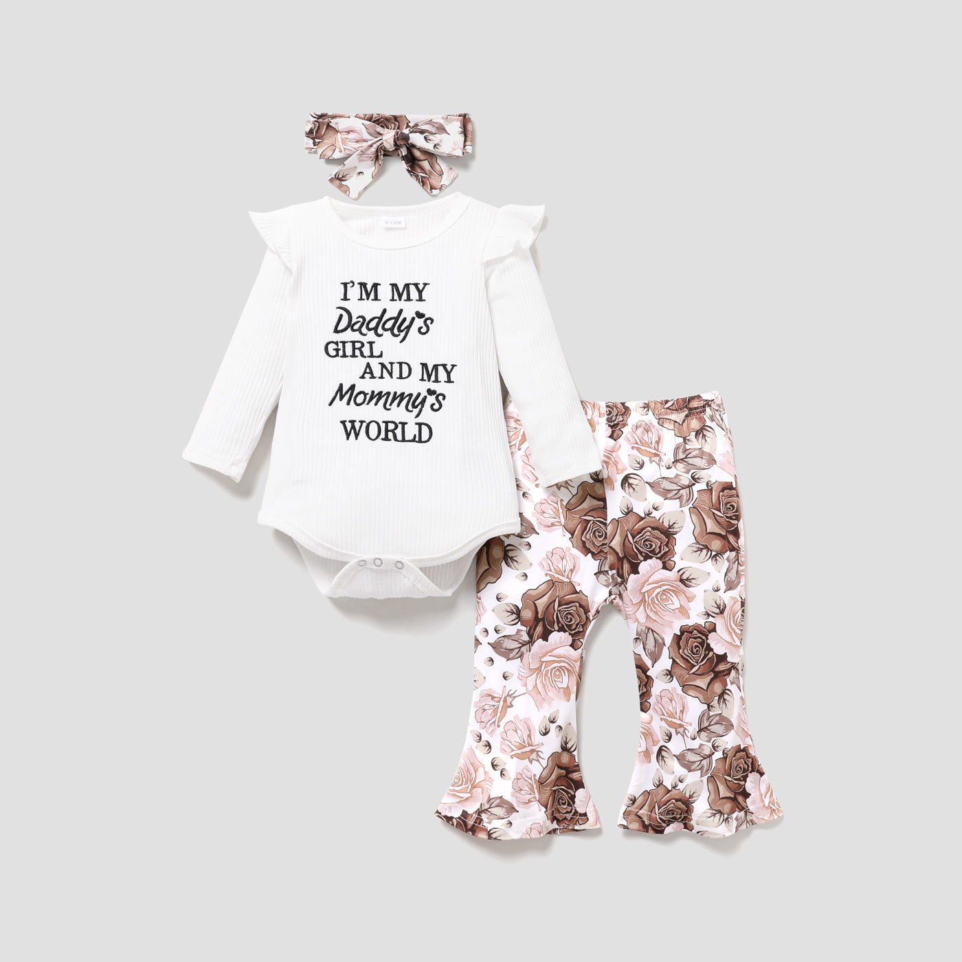 Perfect for your little ones, this sweet 3-piece set features a ribbed long-sleeve romper with an embroidered letter that reads I’m my Daddy’s GIRL AND MY Mommy’s WORLD on the front, sunflower floral print bell bottom pants with an elasticized waist, and a matching headband.