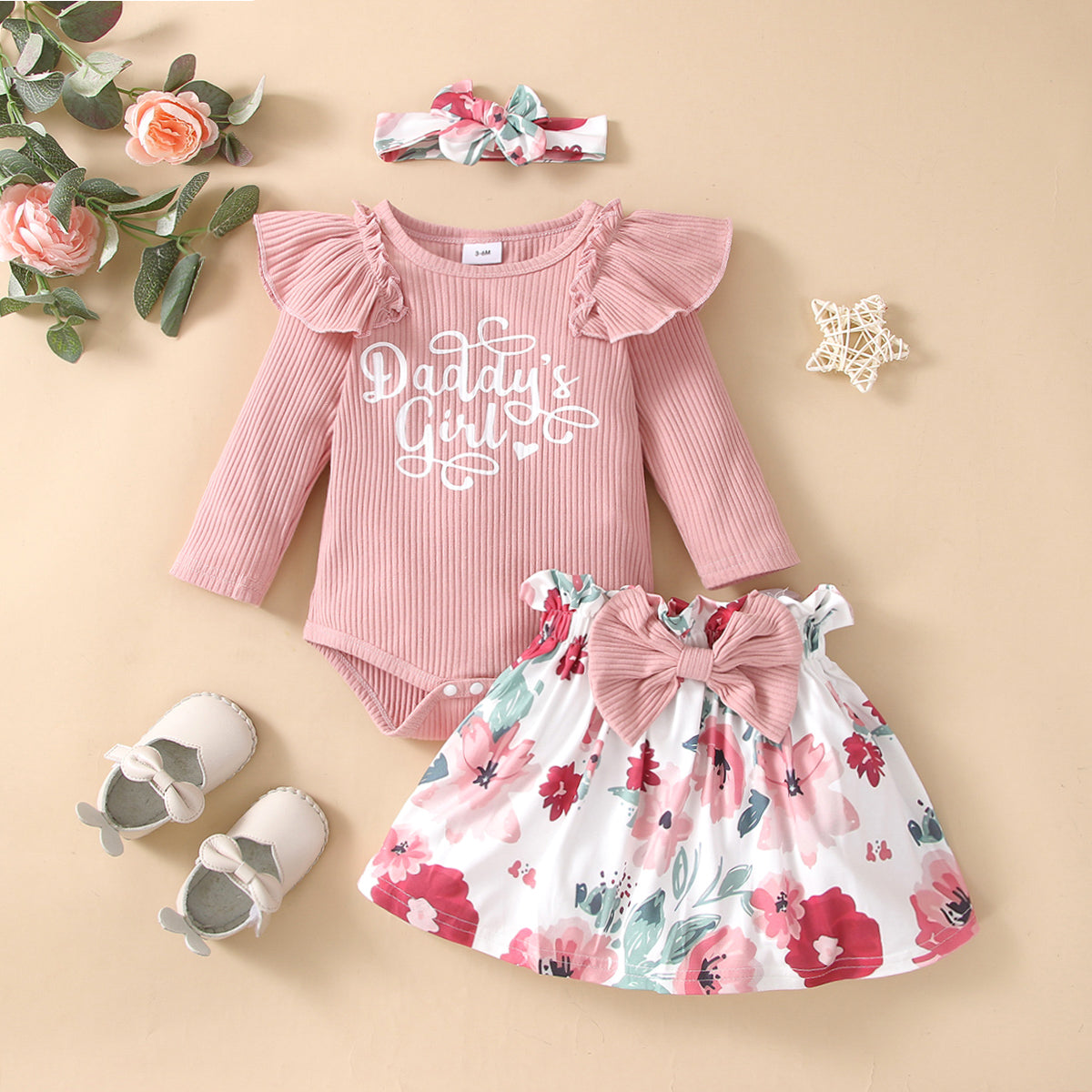 Sweet and stylish baby romper set perfect for Fall and Winter. Features a ruffle edge design, ‘Daddy’s girl’ letter print on the romper, and a waist bowknot decor on the floral skirt to complement the overall look.
