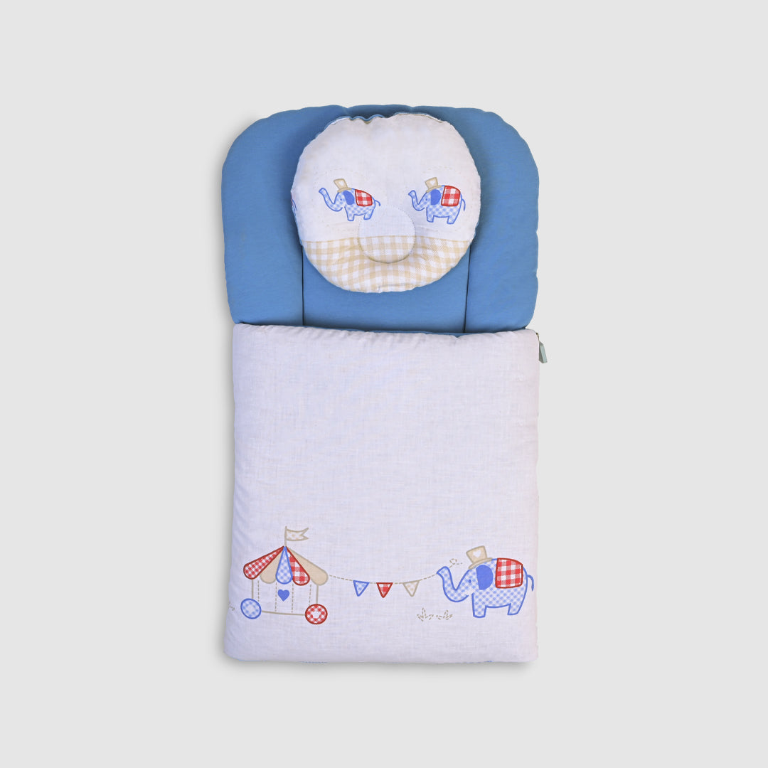 Elevate your baby’s comfort with our Baby Bedding Set with Pillow – Deep Blue and Elephant Circus Embroidery. This set not only adds elegance but also a playful ambiance with its delightful circus-themed design, showcasing colorful elephants that will charm both baby and parents.