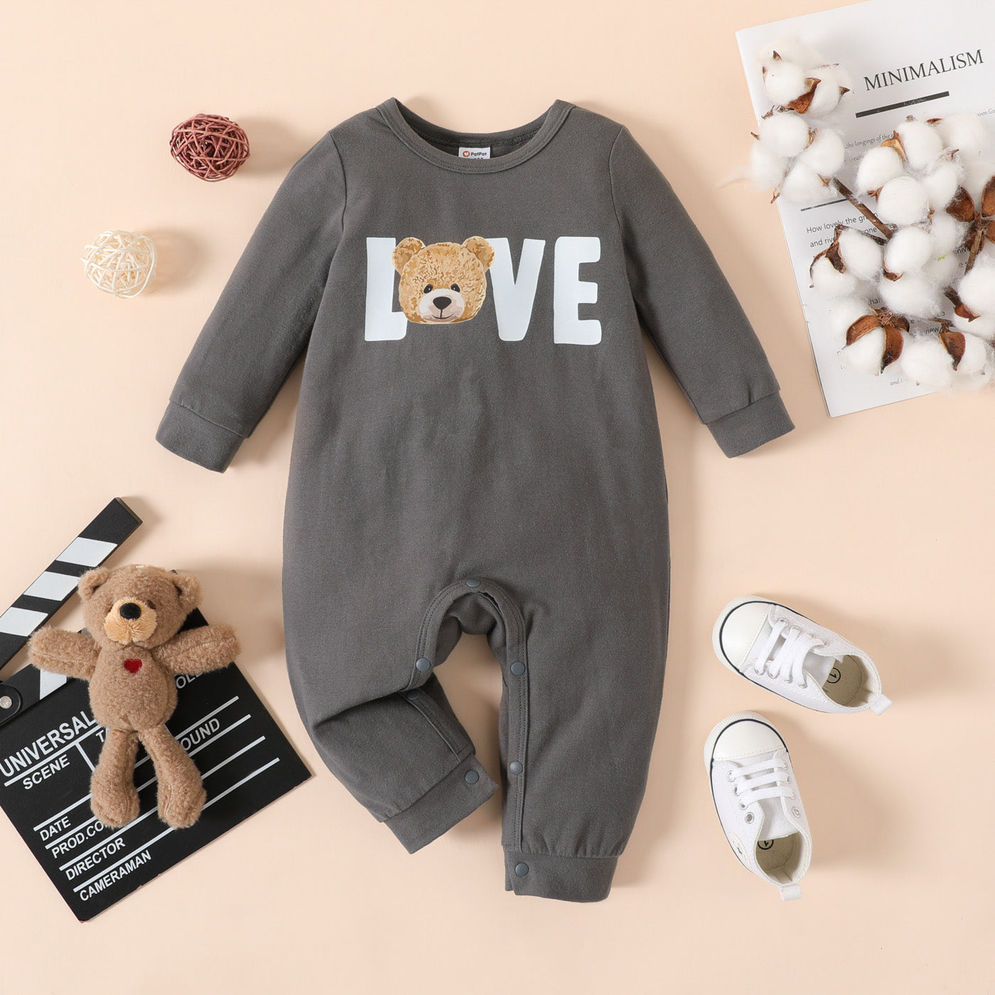 Adorable grey long-sleeve jumpsuit with a cute bear and letter print design on soft and comfy 95% cotton fabric that is perfect for your baby boy.