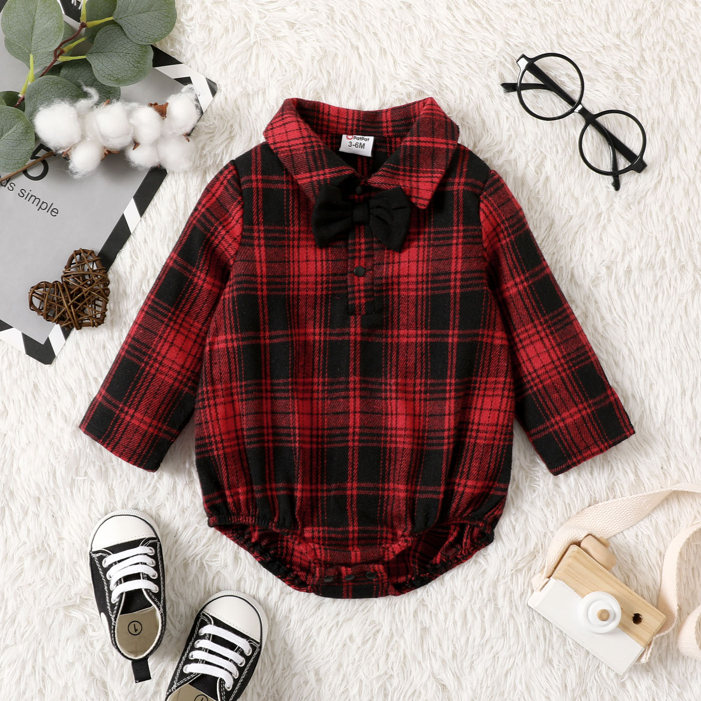 Comfy plaid long-sleeve romper featuring bow-tie decor.