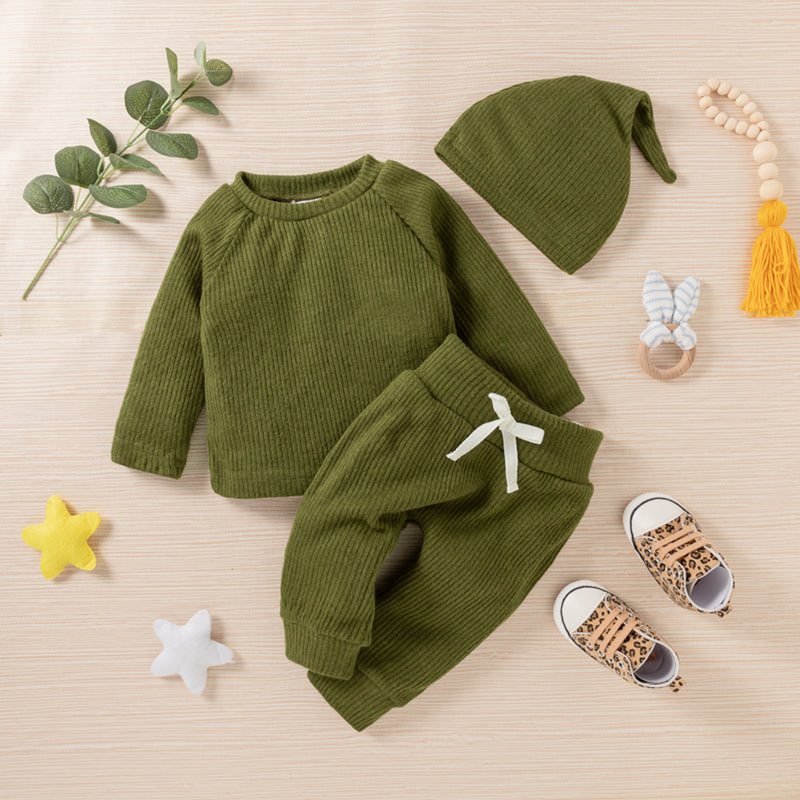 Cozy up your little one in our baby solid ribbed long-sleeve pullover and trouser set. Perfect for fall, winter, and spring, this basic set includes a top, trouser, and hat, and is soft and comfy for all-day play.