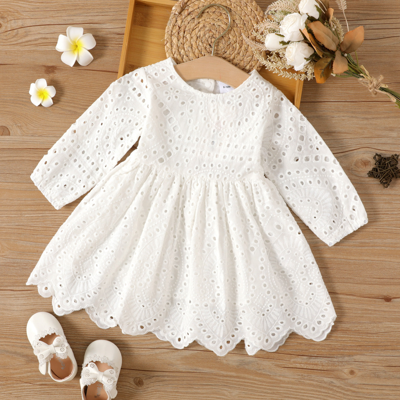Chic and sweet, this 100% cotton long-sleeve hollow floral embroidered baby girl dress is perfect for any season.