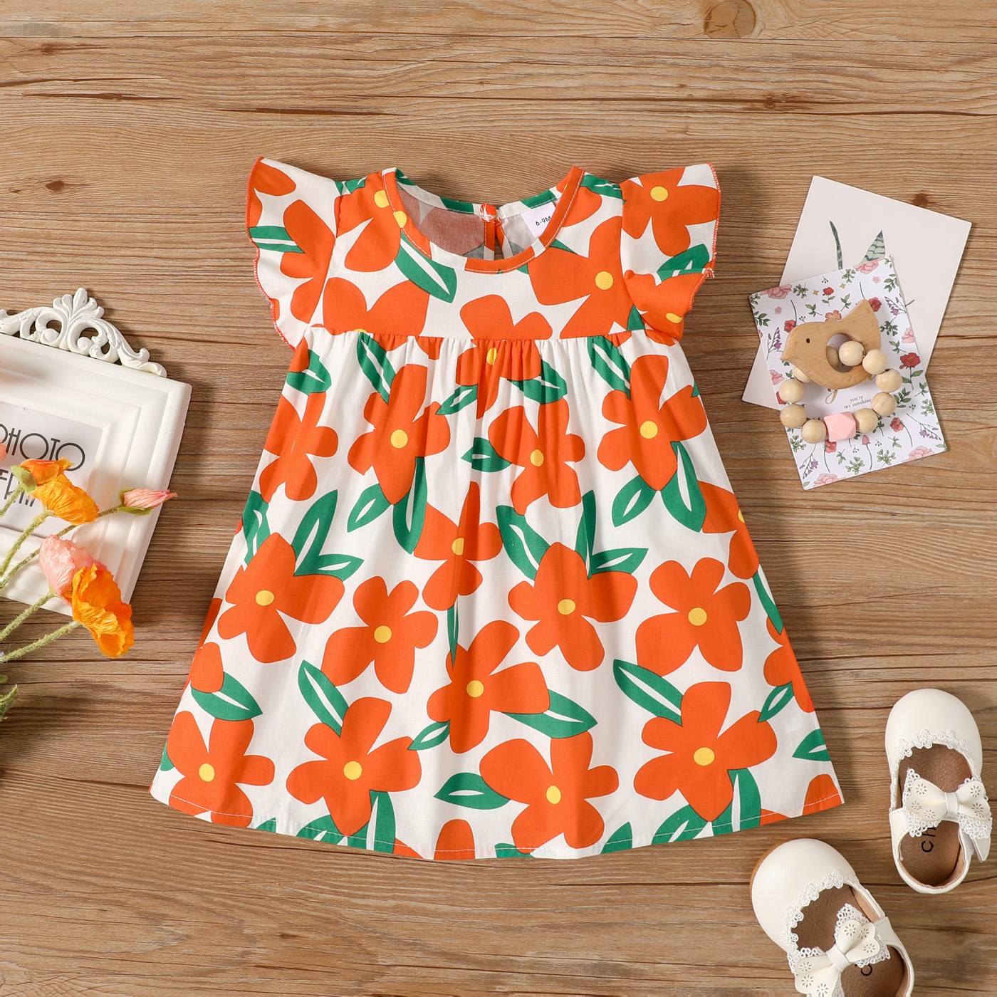 Be charmed by the baby girl allover floral print flutter-sleeve dress, designed to give your little one a chic, childlike vibe that combines style and comfort.