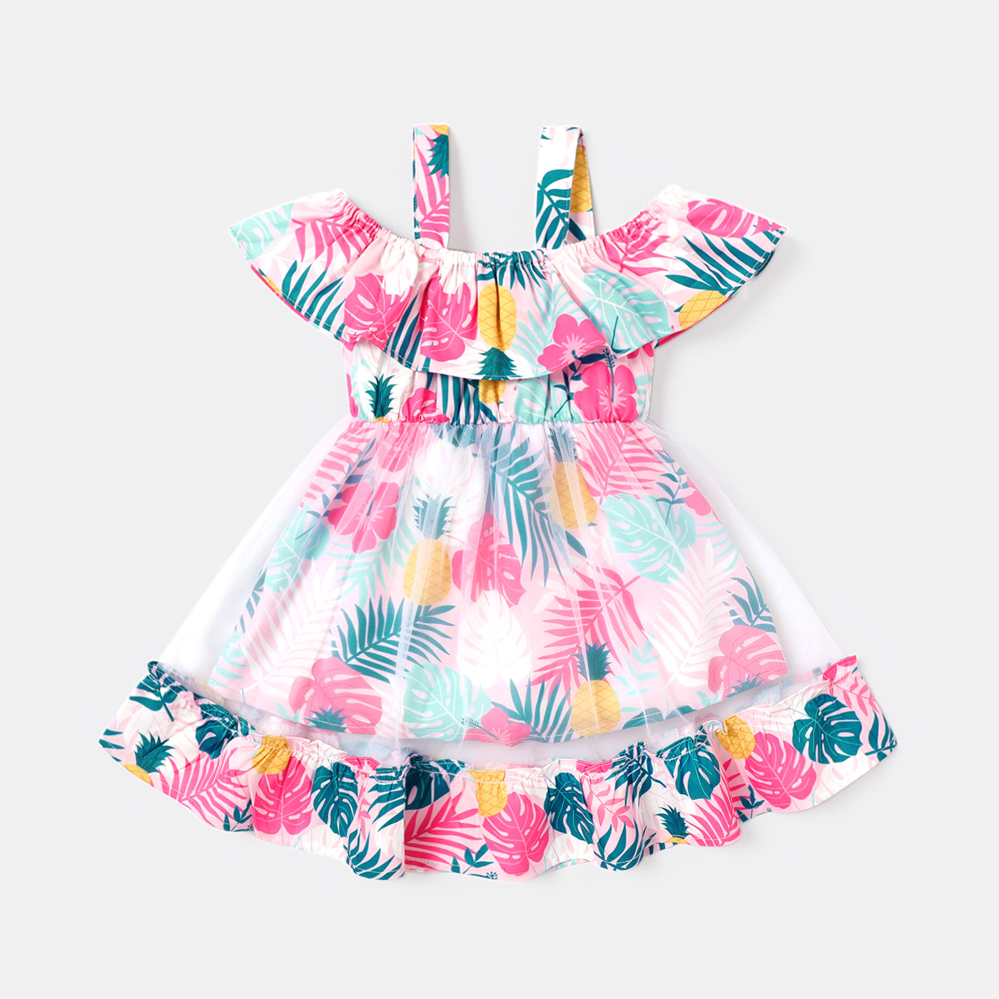 Home » Shop » Baby Girl Allover Plant Print Cold Shoulder Sleeveless Ruffled Mesh Dress