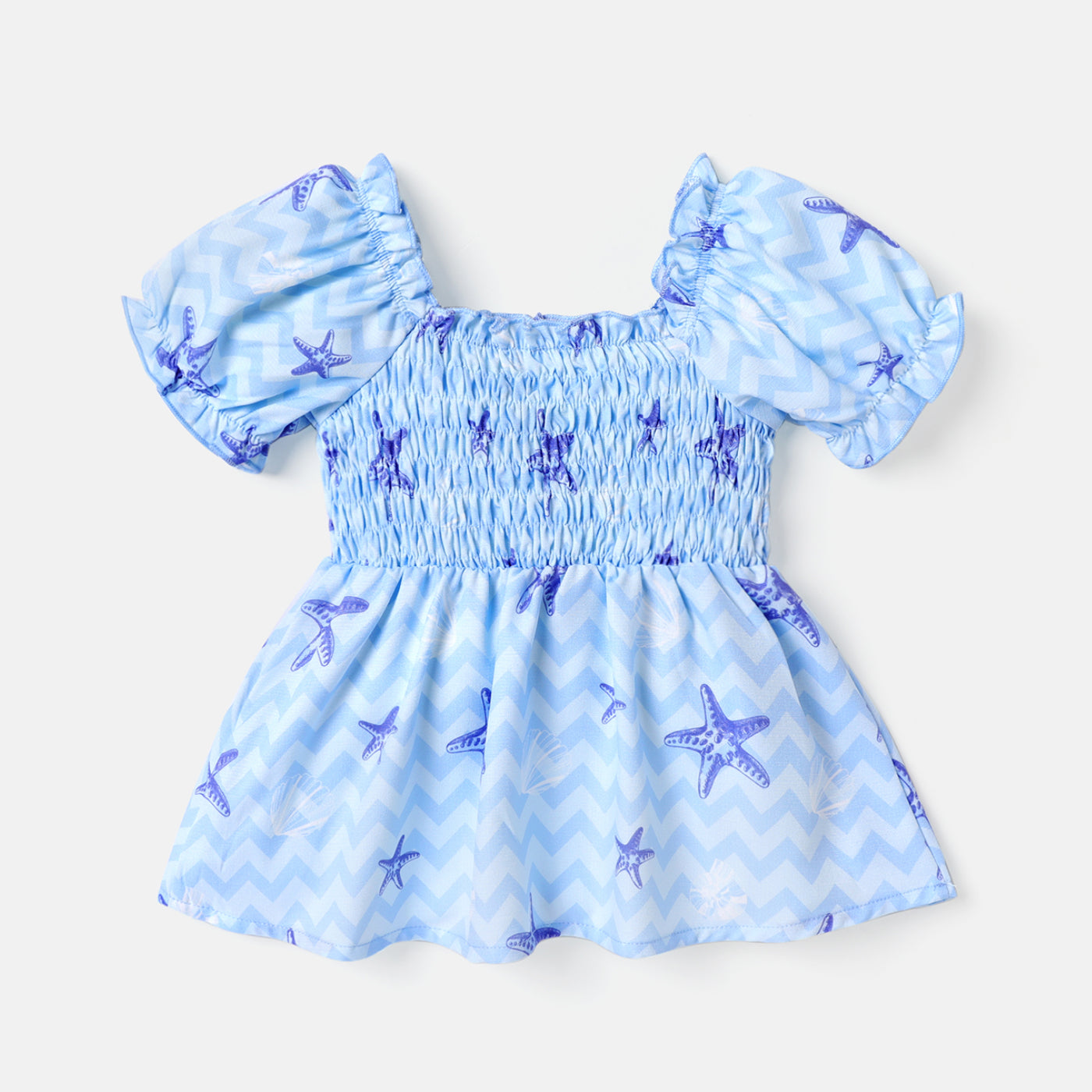 Home » Shop » Baby Girl Allover Starfish Print Blue Puff-sleeve Shirred Dress