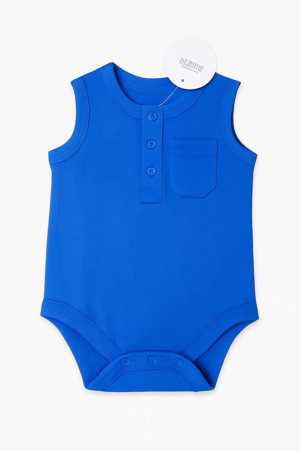 This Blue Sleeveless Bodysuit with Pocket keeps infants cool, comfortable, and stylish.