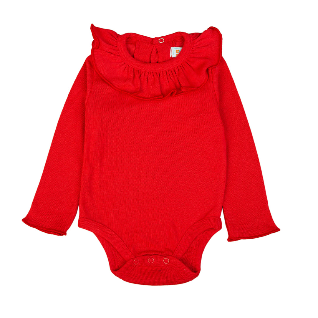 Dress Your Little One in Style with Our Bold Red Ruffle Collar Baby Bodysuit