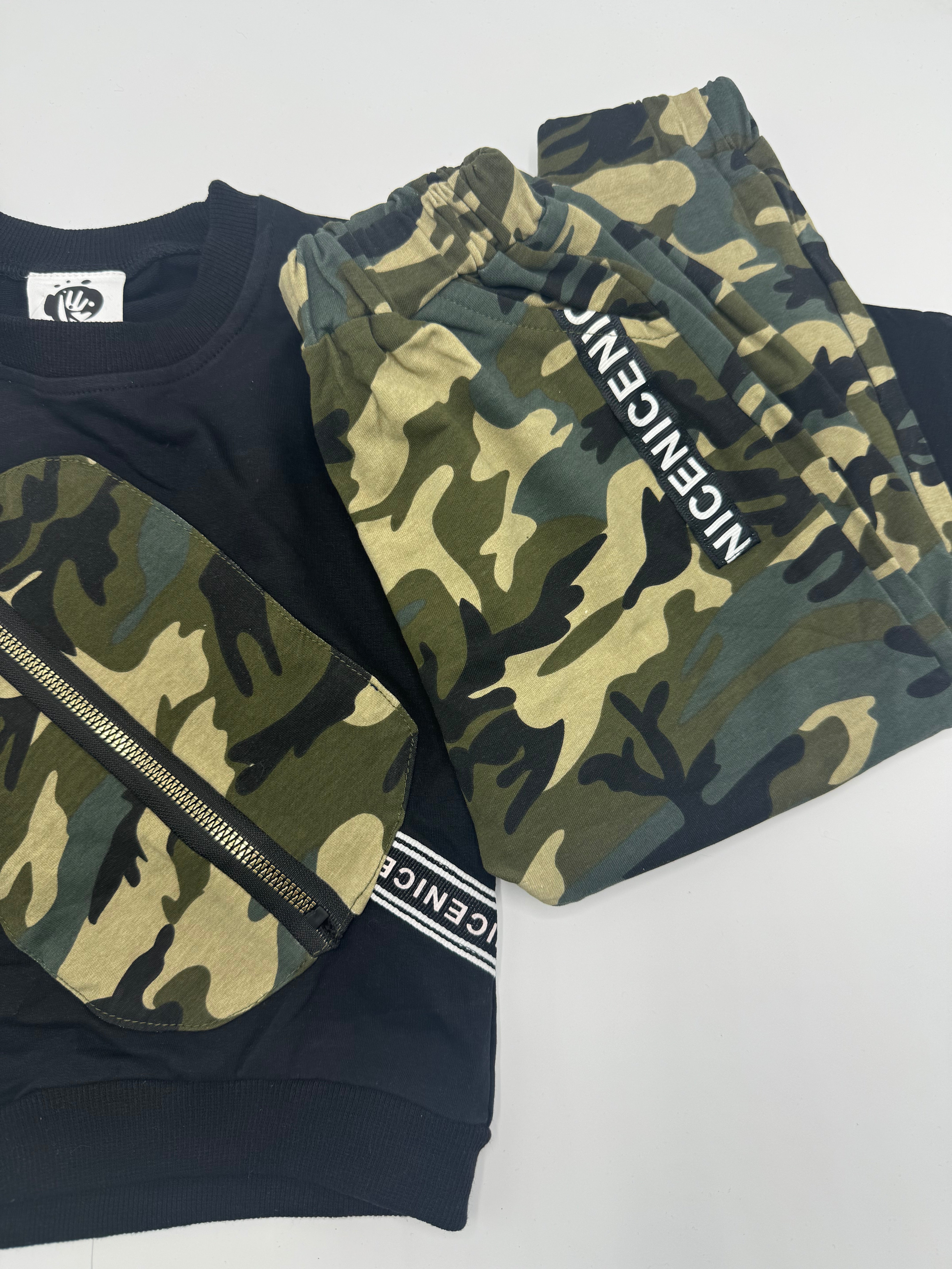 This 2-piece sweat shirt and sweat pants set features a camouflage design, perfect for blending in with your surroundings. Made from comfortable sweatshirt material, you can stay cozy while staying hidden. Great for outdoor activities and everyday wear.