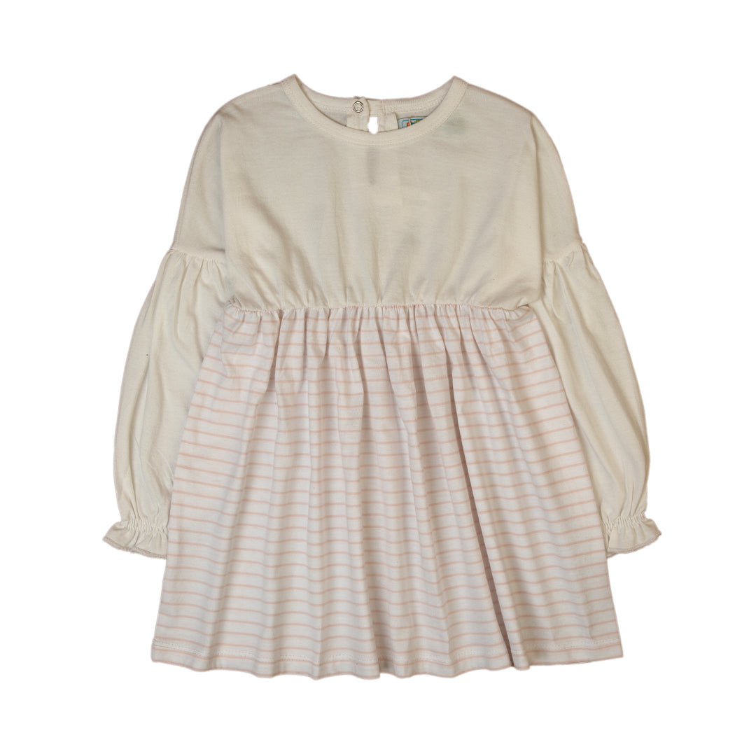 Dress your little one in our Cream and Soft Striped Long Sleeve Dress, featuring a charming cream top with gentle pink stripes on the skirt. This dress combines warmth and style, perfect for any occasion.