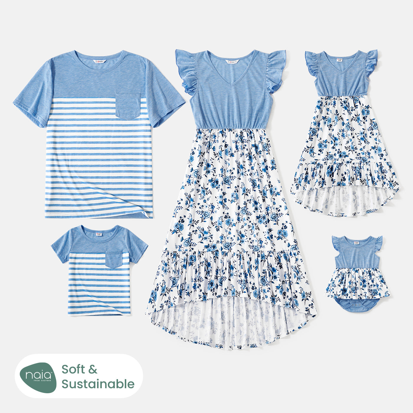 Perfect matching floral-print/striped dresses and T-shirt sets for the whole family.