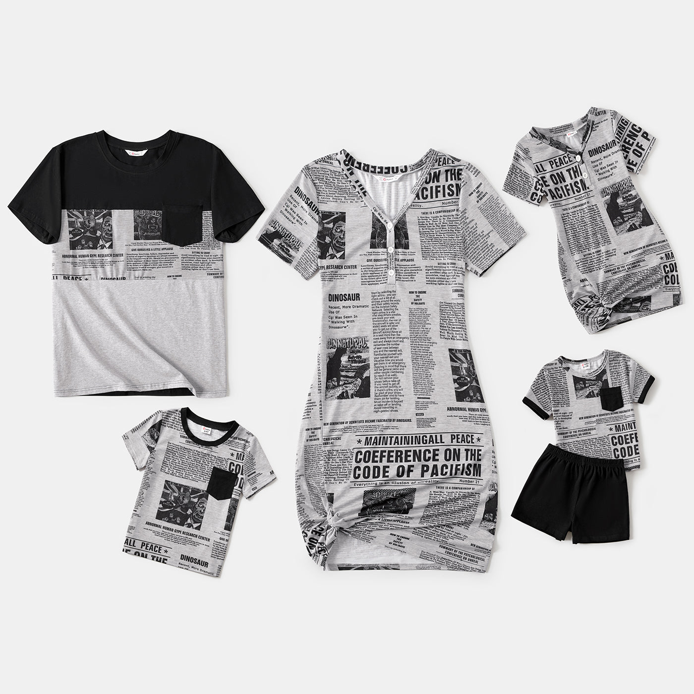 Family Matching Newspaper Print V Neck Short-sleeve Twist Knot Bodycon Dresses and T-shirts Sets