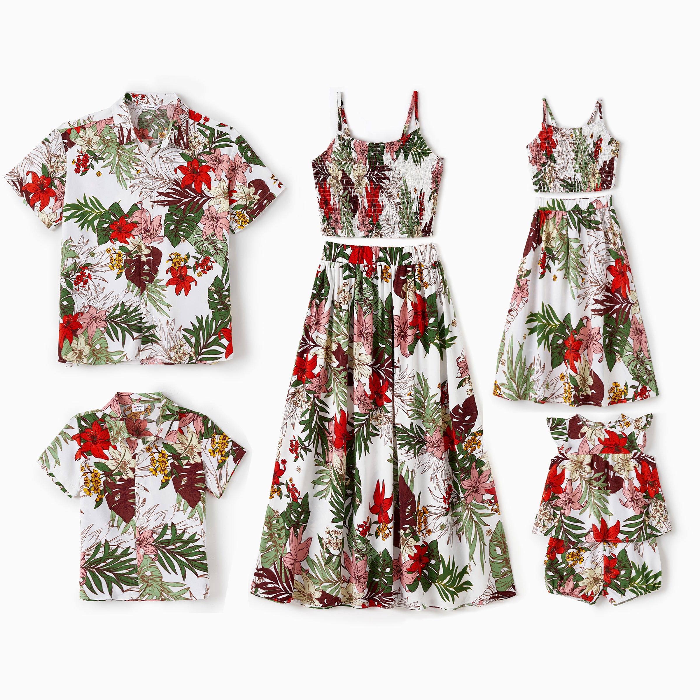 Elevate your family’s fashion game with our tropical plant print matching outfits, including a short-sleeve vacation button-up shirt, a shirred cami top with A-line skirt set. Perfect for casual daily wear, getaway, and outdoor parties.