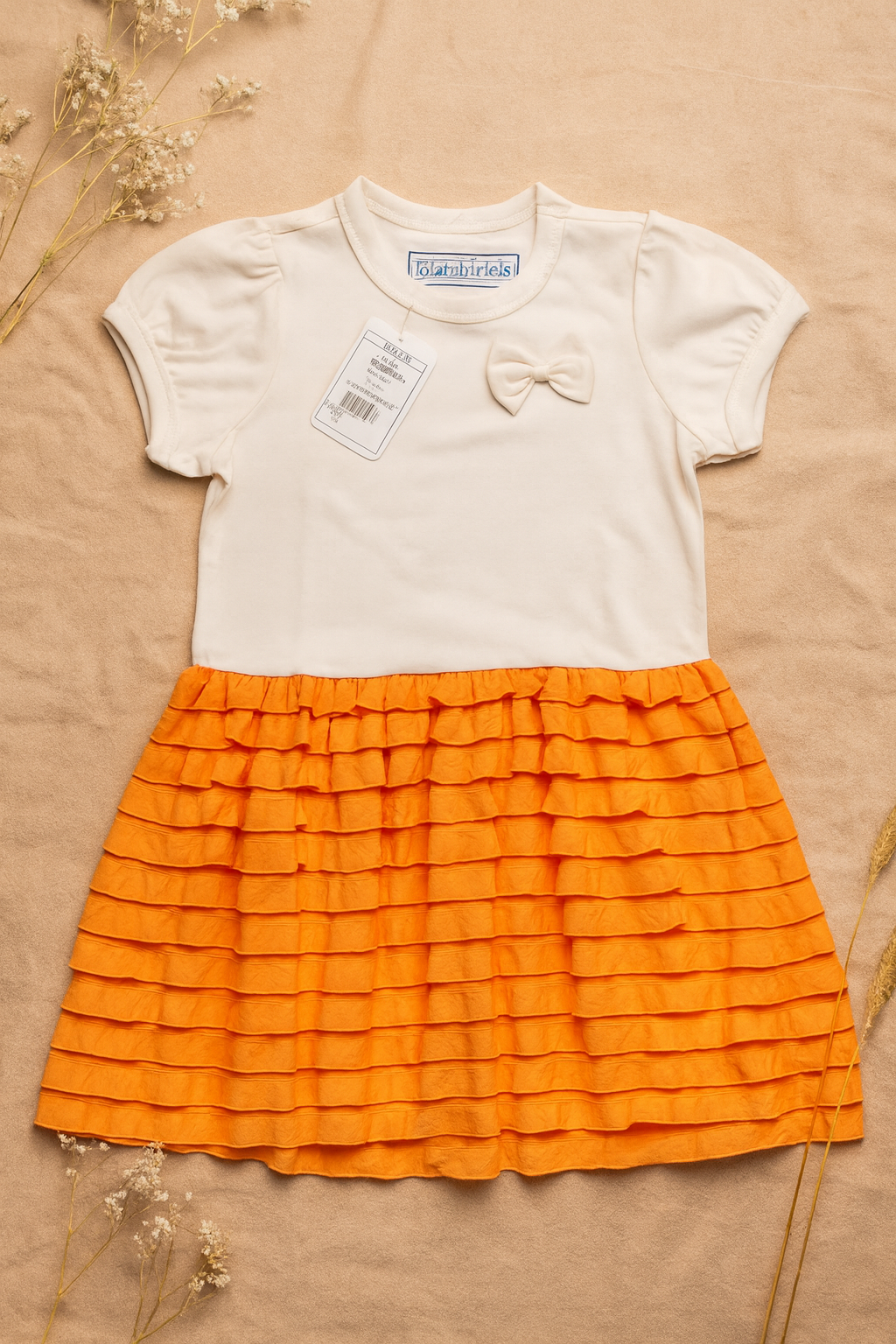 Bright, playful, and oh-so-stylish — this adorable dress is designed to bring cheer to every occasion. The ivory satin-like bodice features a sweet bow detail for a touch of charm, while the vibrant orange layered ruffle skirt adds movement and fun to her outfit.