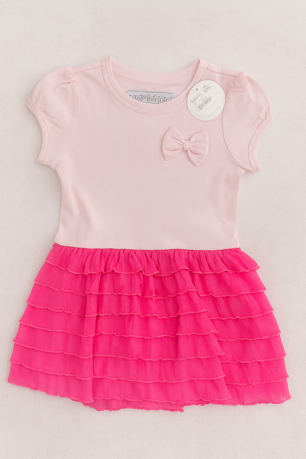 Add a touch of sweetness to your baby girl’s wardrobe with this adorable two-tone frock. Featuring a soft pastel pink top with a cute bow detail and a vibrant hot pink layered ruffle skirt, this dress is designed to keep your little one comfortable while looking stylish.