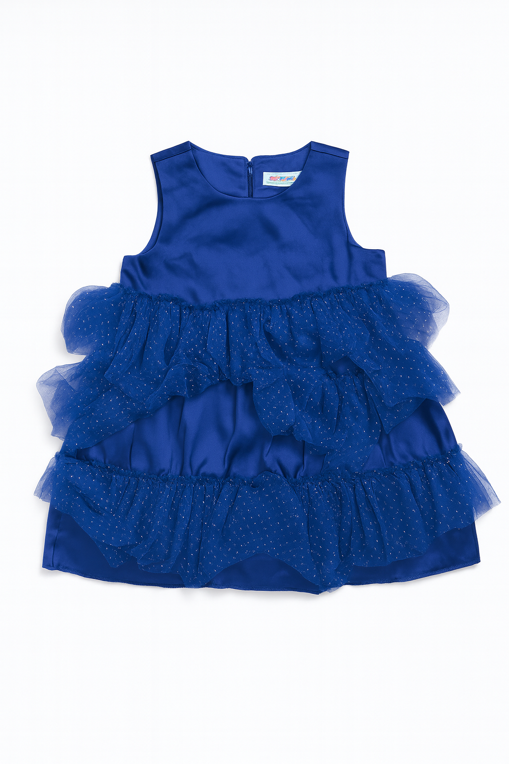 Elegant infant frock in navy with triple-layer design. Adds volume and charm.