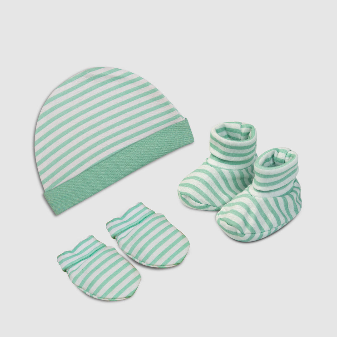 Introducing the Green Stripe Baby Gift Set—an essential addition to your baby’s wardrobe! This charming set features a cozy hat, snug mittens, and adorable booties, all designed with refreshing green stripes for a stylish look.