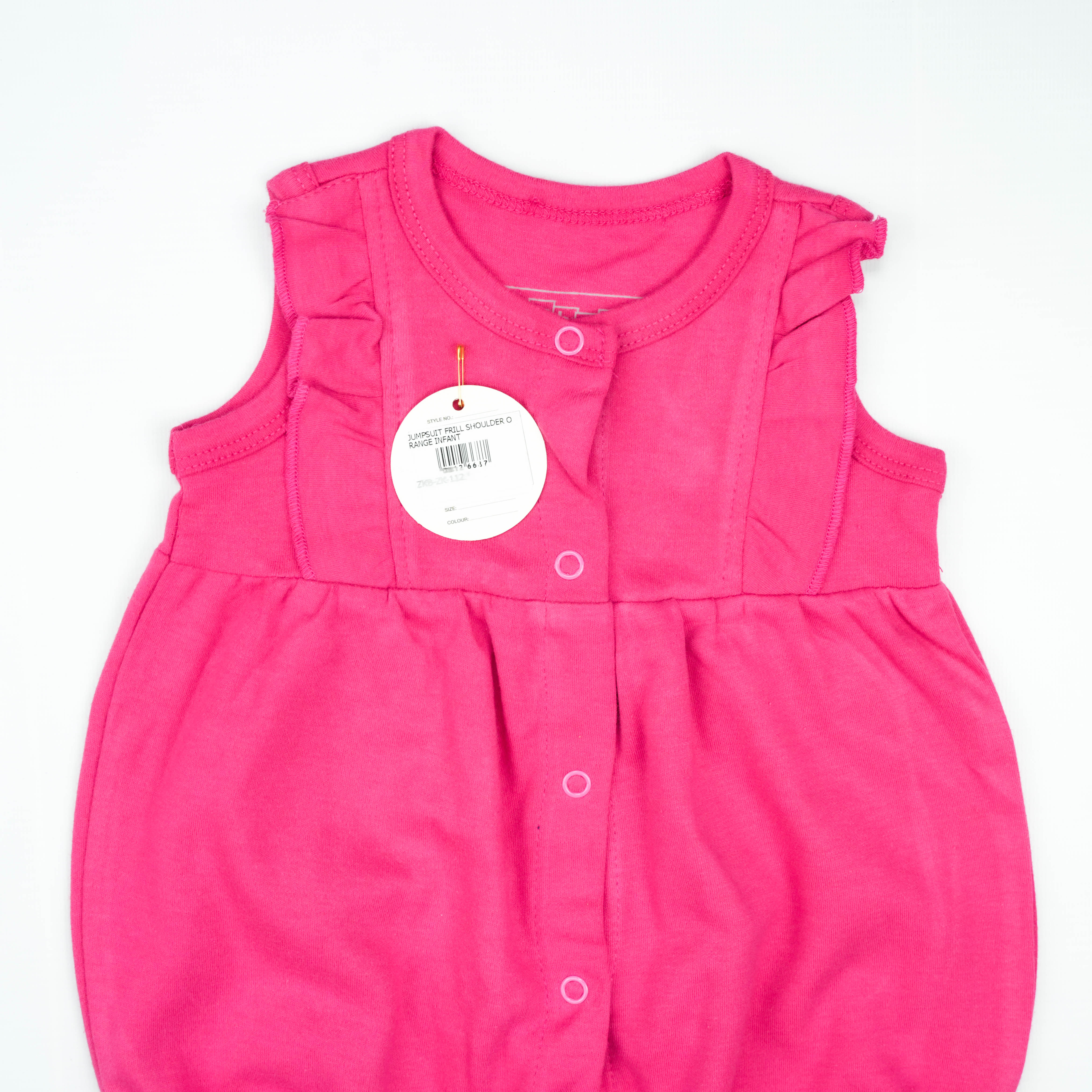 Introducing our JUMPSUIT FRILL SHOULDER ORANGE INFANT, the perfect blend of style and comfort for your baby. This vibrant orange jumpsuit is designed to make your little one stand out while providing ease of movement.