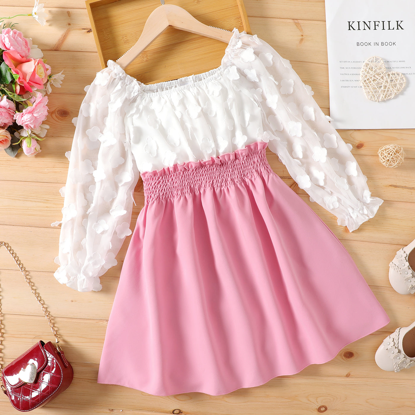 Girls will be comfortable and gorgeous in this elegant Kid Girl 3D Floral Design Smocked Splice Square Neck Mesh Long-sleeve Dress, perfect for any occasion.