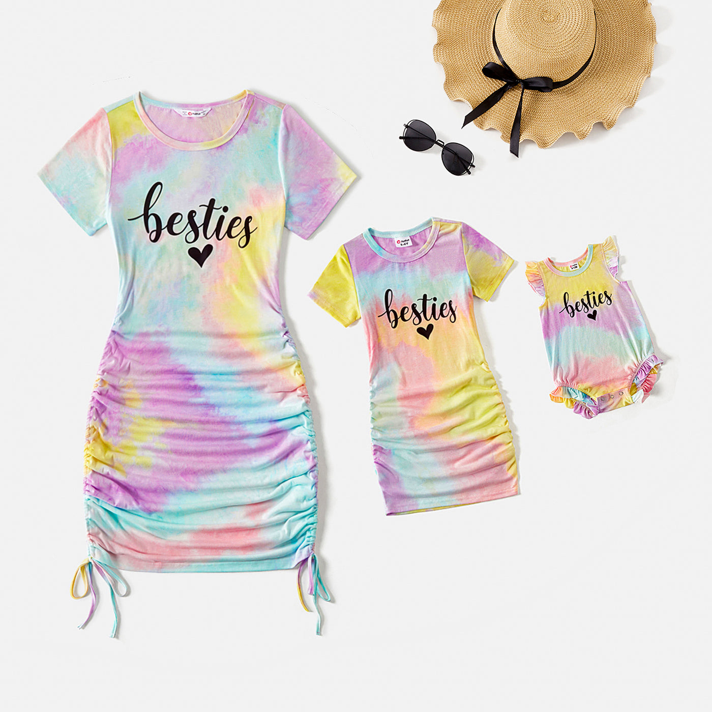 Embrace summer fun with the matching Letter Print Tie Dye Short-sleeve Drawstring Ruched Bodycon Dress, available in sizes for women, babies, toddlers, and girls. Designed for moms and their little ones, this dress is the perfect addition to your summer wardrobe.