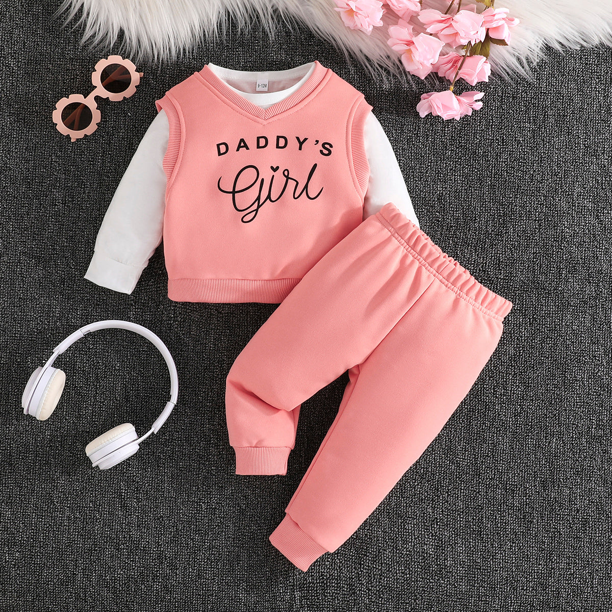 Monogram Print Vest & Solid Color Long Sleeve with Pants Set