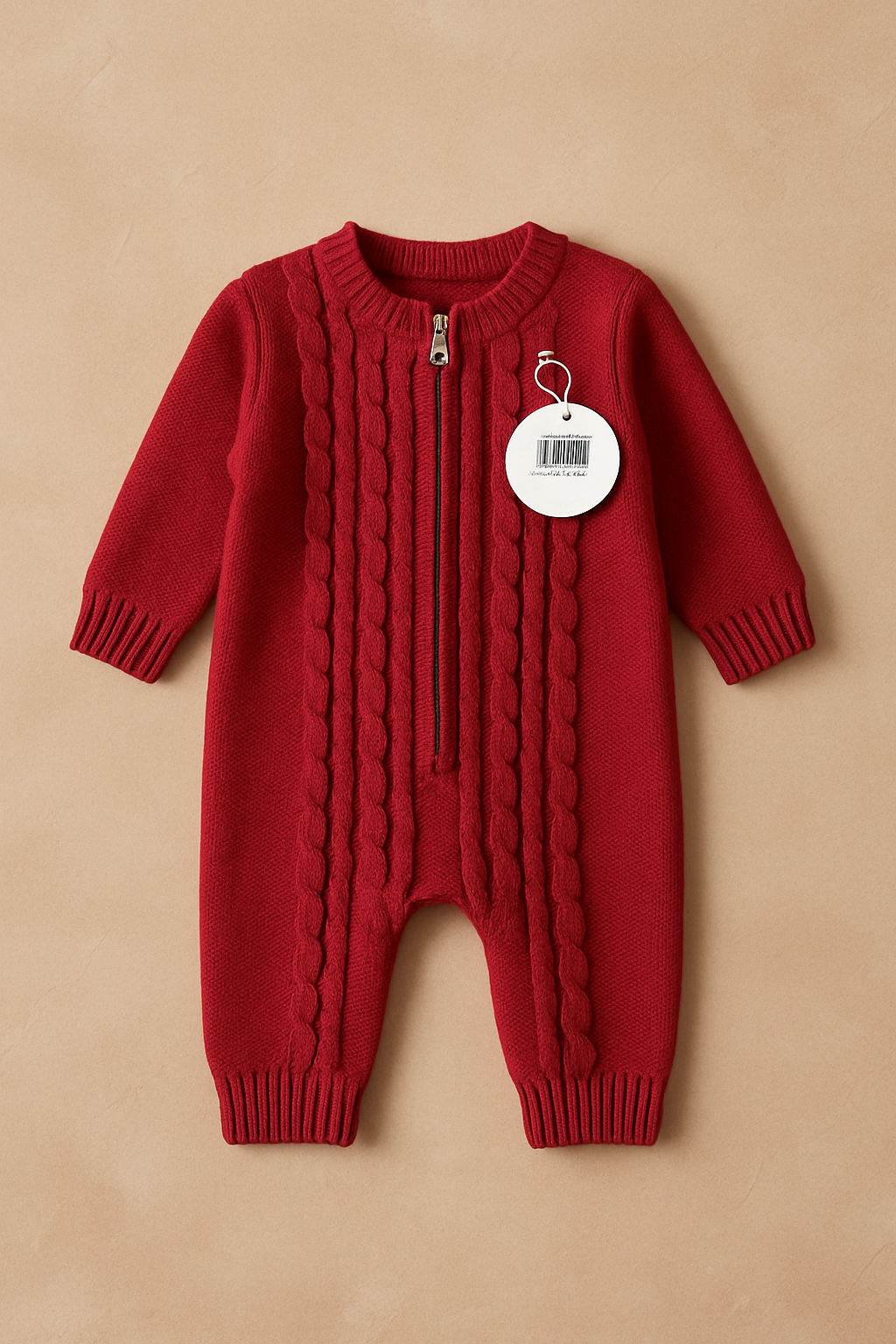 Bright, bold, and beautifully cozy – this classic red knitted baby romper is the perfect blend of warmth and style. With its cable-knit detailing and snug fit, it keeps your little one comfortable while adding a festive, timeless charm.