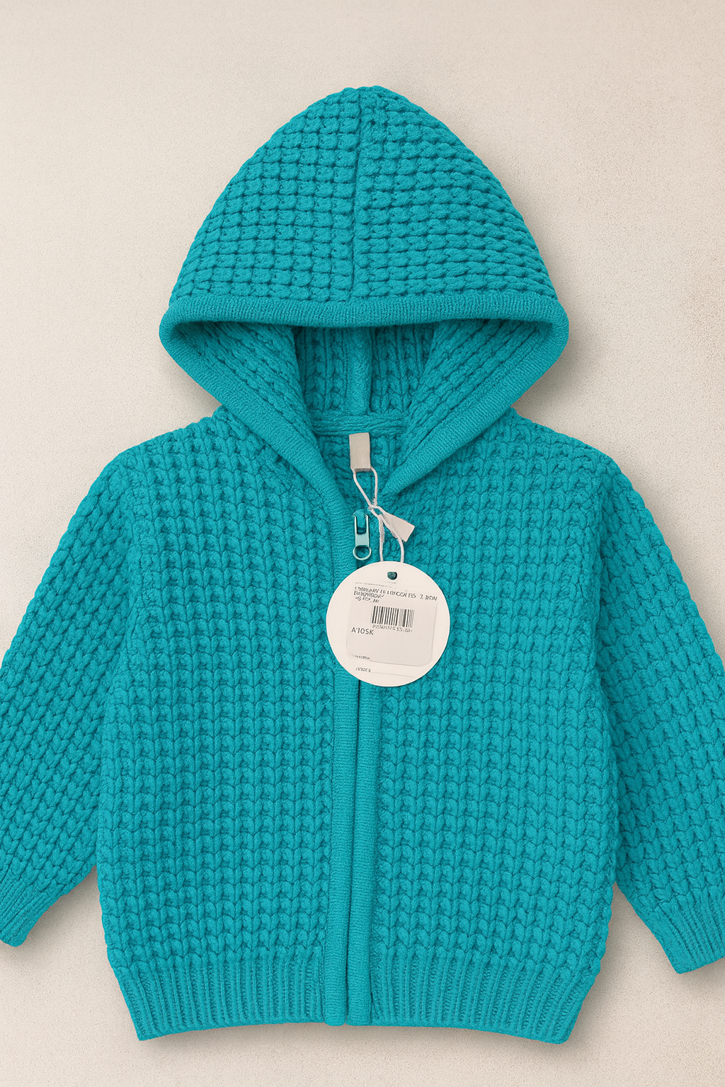 Brighten up your child’s wardrobe with this stylish turquoise knitted hoodie. Made from soft, breathable knit, it’s perfect for layering on cooler days while adding a fun pop of color to any outfit.