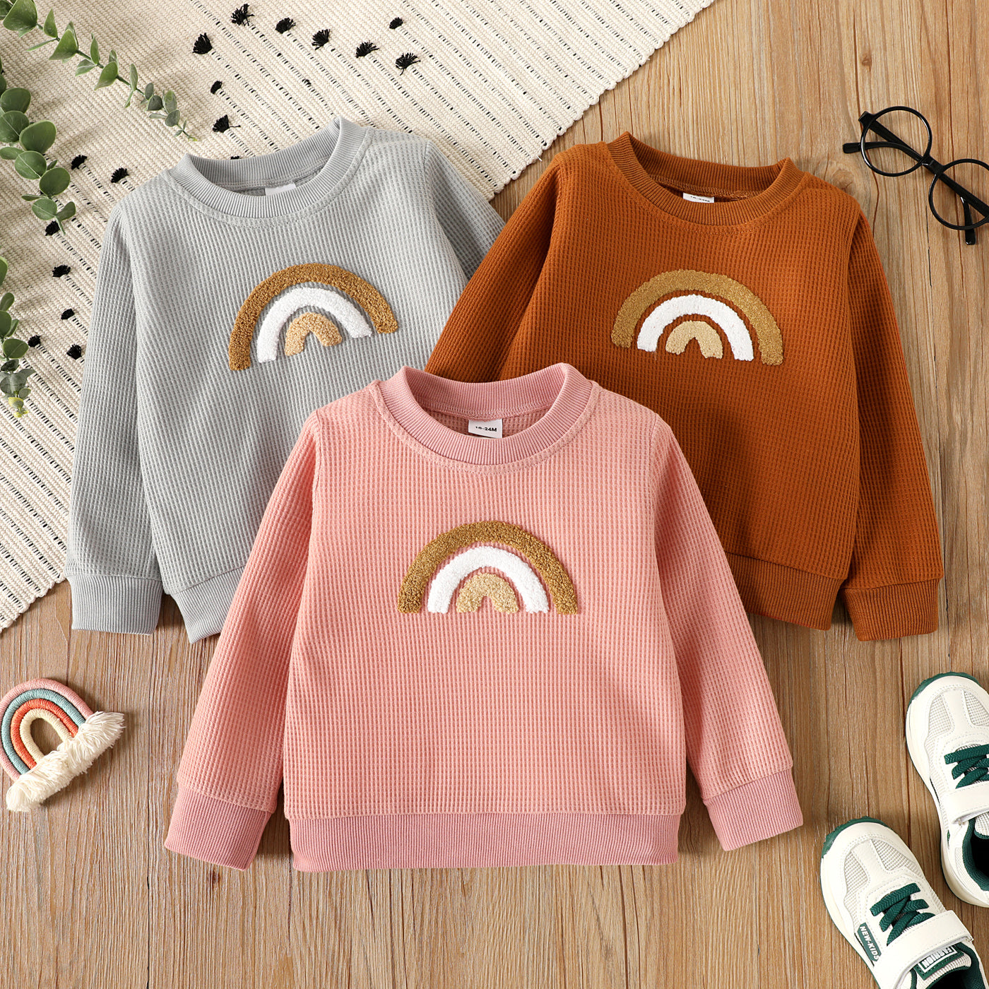 Upgrade your toddler’s top game with rainbow embroidered waffle sweatshirt.
