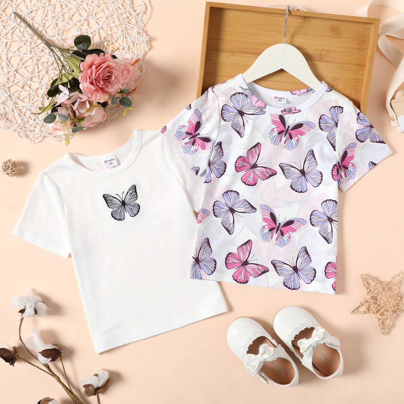 Get mesmerized with our sweet and casual toddler girl butterfly embroidered/print tee, perfect for the summer season.
