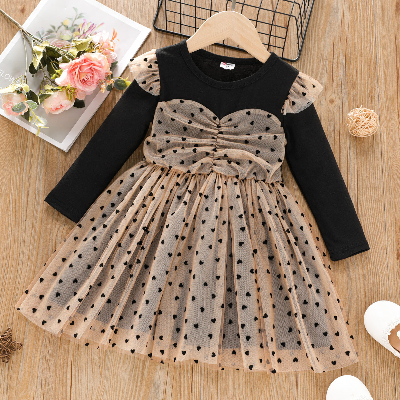 Sweet and stylish toddler girl dress with heart embroidered and mesh splice, suitable for any occasion.