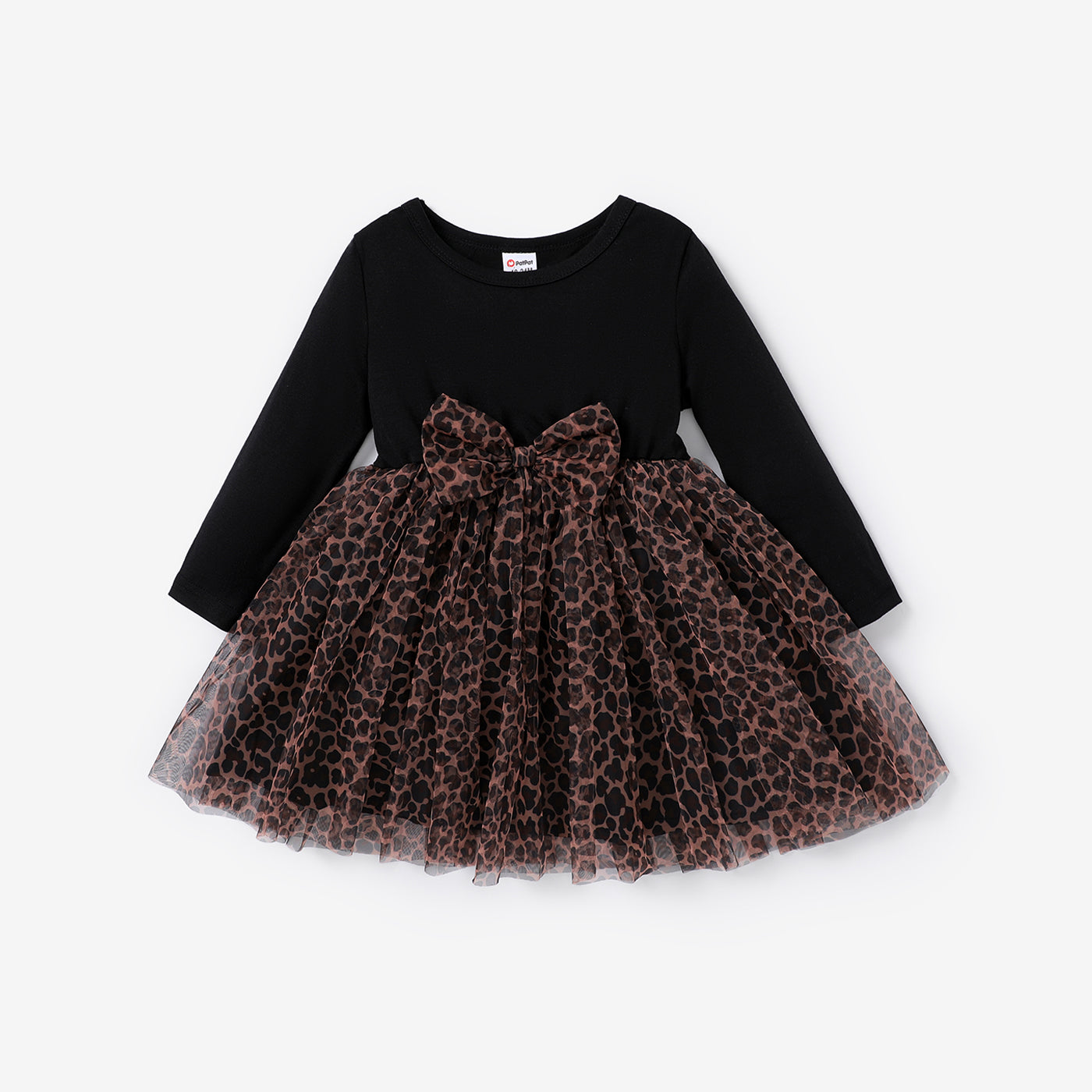 Toddler Girl Leopard Print Mesh Splice Bowknot Design Long-sleeve Dress